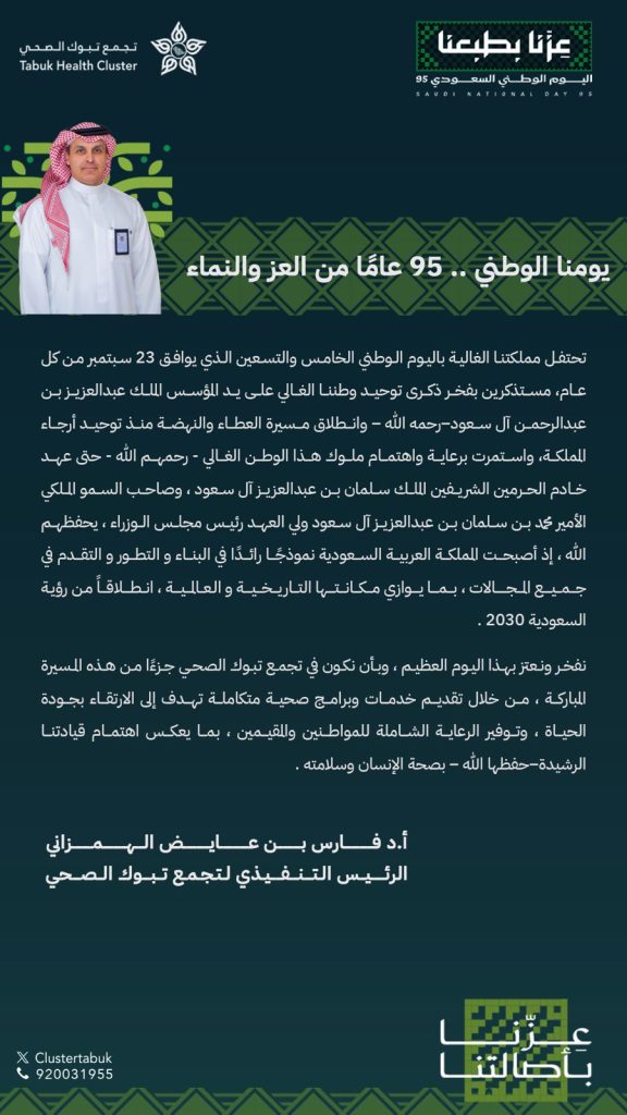 الرئيس التنفيذي لـ #تجمع_تبوك_الصحي أ. د. فارس بن عايض الهمزاني: نفخر باليوم الوطني الـ95 مستذكرين توحيد الوطن ومواصلين مسيرة التنمية تحت قيادة خادم الحرمين الشريفين وسمو ولي عهده الأمين. #اليوم_الوطني_السعودي95 #عزنا_بطبعنا