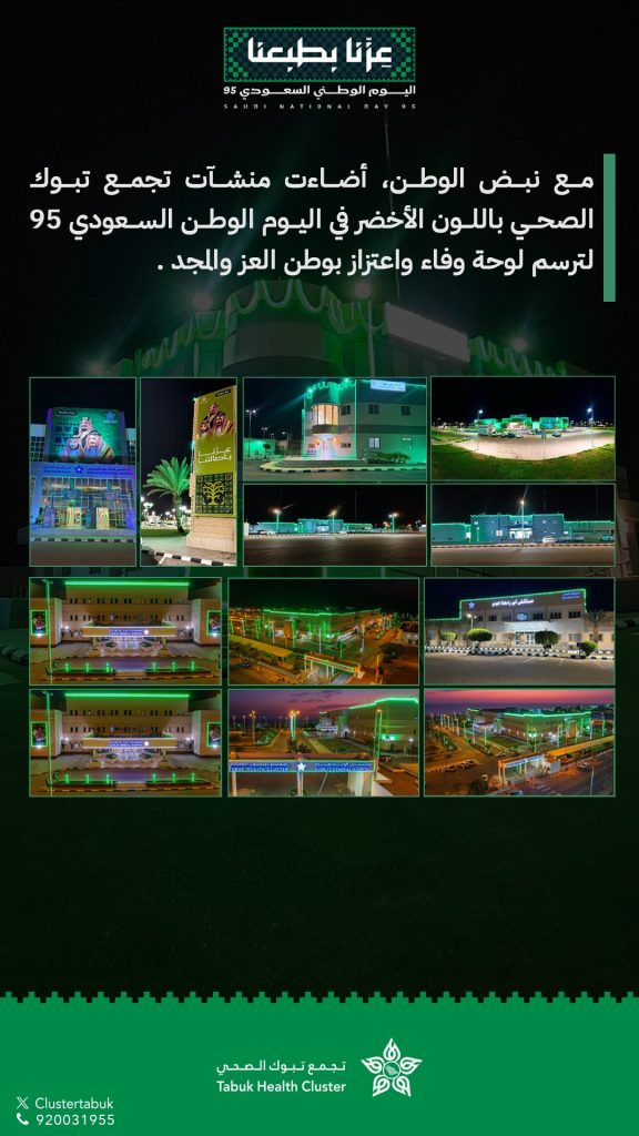 منشآت #تجمع_تبوك_الصحي توشحت باللون الأخضر تعبيرًا عن الفخر والاعتزاز بالوطن.#اليوم_الوطني_السعودي95#عزنا_بطبعنا pic.twitter.com/BW6hV4aUbf