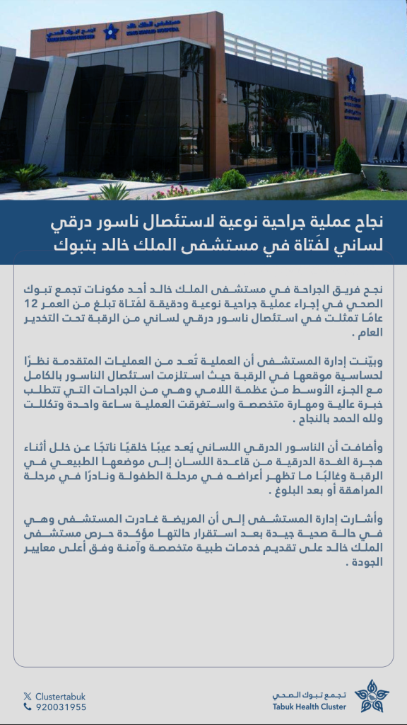 نجاح عملية جراحية نوعية لاستئصال ناسور درقي لساني لفتاة في مستشفى الملك خالد اترك تعليقاً / الأخبار العامة / Ahmed Alaslami نجاح عملية جراحية نوعية لاستئصال ناسور درقي لساني لفتاة في مستشفى الملك خالد قراءة المزيد »