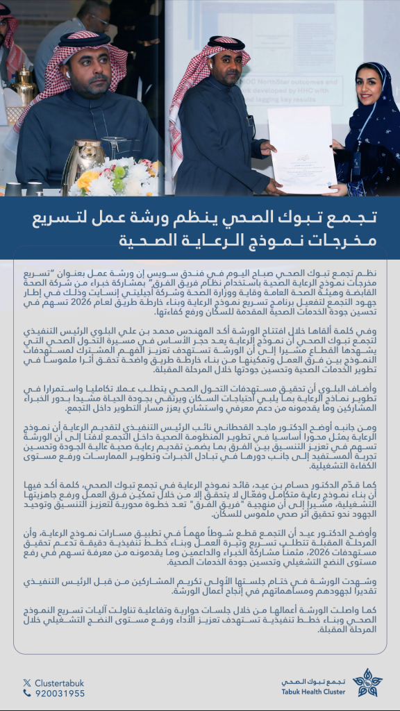 تجمع تبوك الصحي ينظم ورشة عمل لتسريع مخرجات نموذج الرعاية الصحية